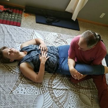 Professional customized Thai massage using gentle but deep techniques of Northern Thailand. You wear your own comfortable stretchy clothes for the session. The work is on a mat on the floor and I use my feet, knees, elbows, forearms, palms, and thumbs to perform Thai massage. The bodywork includes acupressure and stretching. Some moves